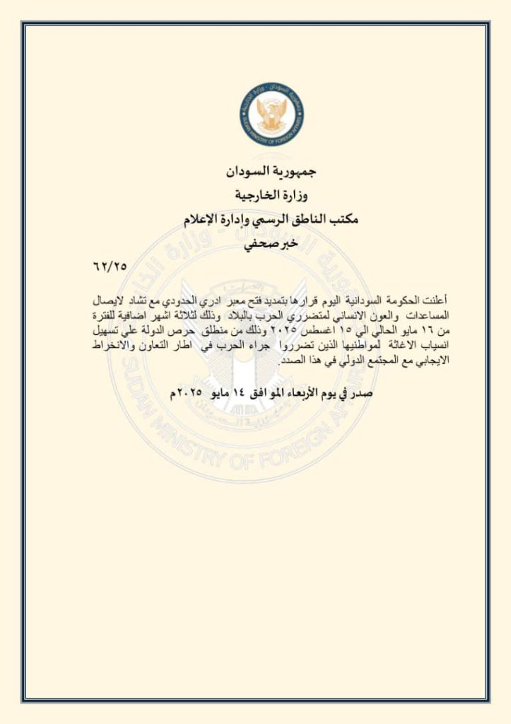 أعلنت الحكومة السودانية اليوم عن قرارها بتمديد فترة فتح معبر “أدري” الحدودي مع دولة تشاد لمدة ثلاثة أشهر إضافية، وذلك بهدف ضمان إيصال المساعدات الإنسانية والعون الإغاثي للمتضررين من الحرب داخل البلاد.
